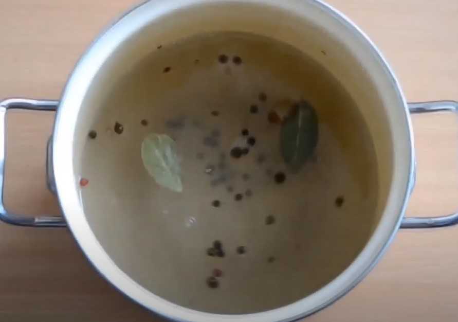 4. Готовим маринад: кипятим воду, снимаем ее с огня, растворяем в воде соль, добавляем лавровый лист и перец горошком, оставляем на 15 минут настаиваться.