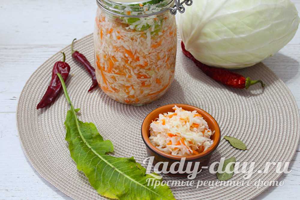 - Вариант «за сутки». Капусту режут на квадратные куски, морковь натирают на крупной терке. Укладывают в банку, заливают маринадом. Затем банку плотно укутывают и оставляют на сутки в тепле.