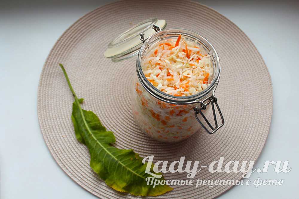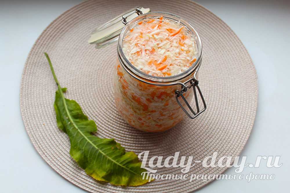 - Капуста с морковью. Ингредиенты мелко шинкуются, смешиваются, укладываются в банки и заливаются рассолом.