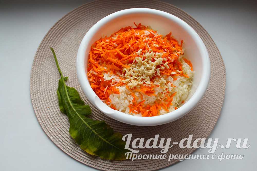 Во вместительной посуде соединяем измельченные капусту, морковь и хрен. Если вы собираетесь квасить капусту в этой же посуде, то лучше использовать эмалированную или стеклянную.