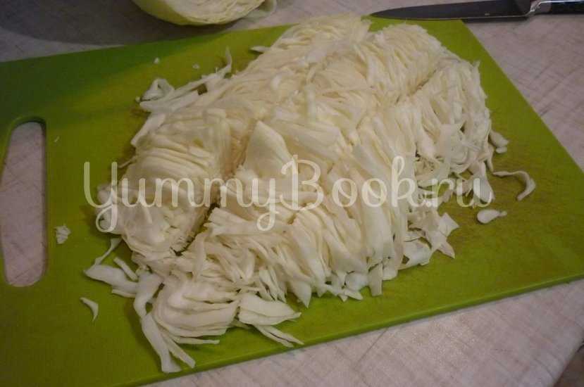 - Капусту помойте, удалив верхние листья — они обычно бывают грязными или подпорченными насекомыми. Разрежьте кочан, вырежьте кочерыжку. Оставшуюся часть кочана мелко нашинкуйте.