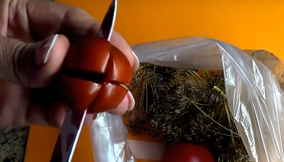 2. Теперь берем помидоры и делаем на них два разреза крест-накрест.