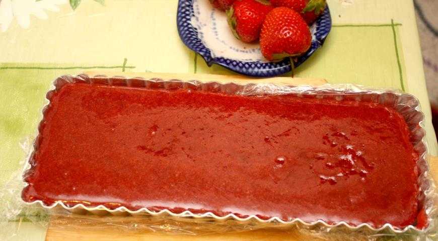 На ровную поверхность поставьте кондитерское кольцо, застелите его внутри пищевой пленкой и залейте желе. Поставьте его в морозильную камеру для застывания.