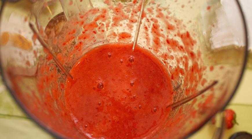Измельчите ягоды блендером, а затем перетрите массу через сито с помощью венчика, чтобы все косточки и кожура остались в сите.