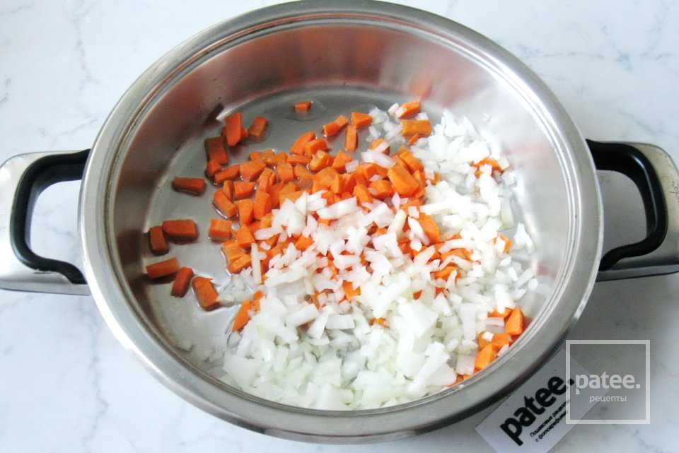 В сотейник или кастрюлю с антипригарным покрытием наливаем подсолнечное масло и кладём нарезанные лук и морковь. Припускаем 10 минут.