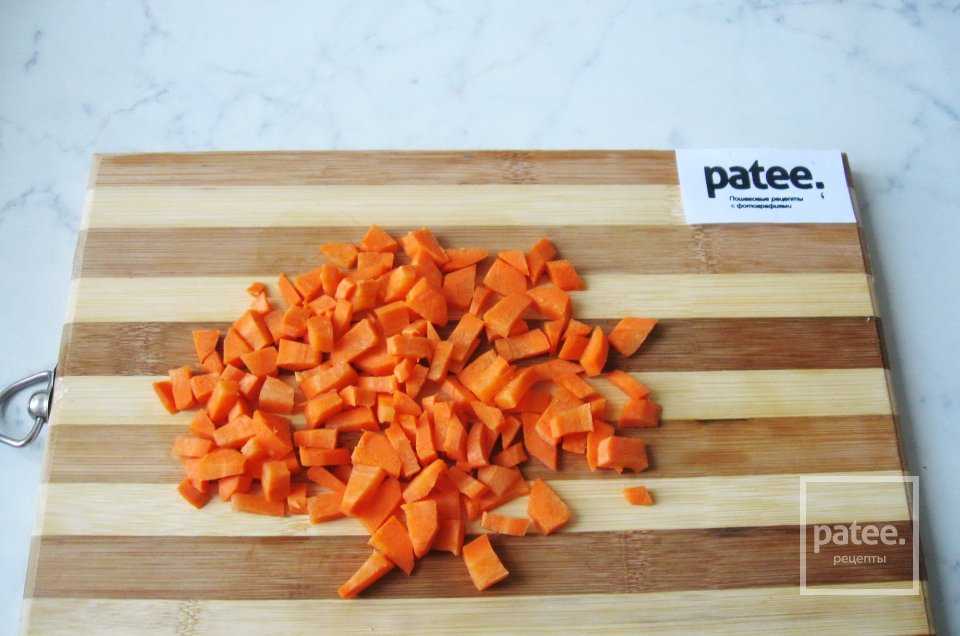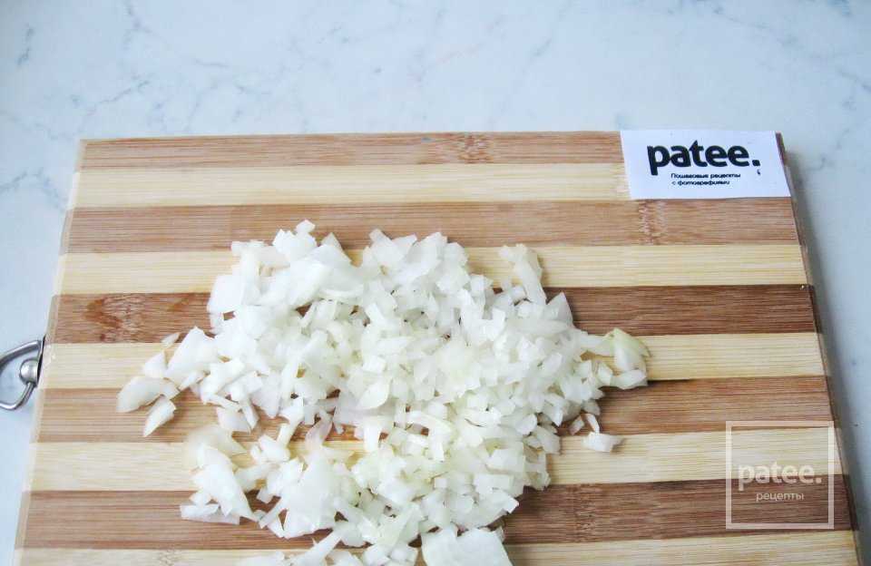 - Лук очистить, порезать мелкими кубиками и соединить с мякотью шампиньонов.