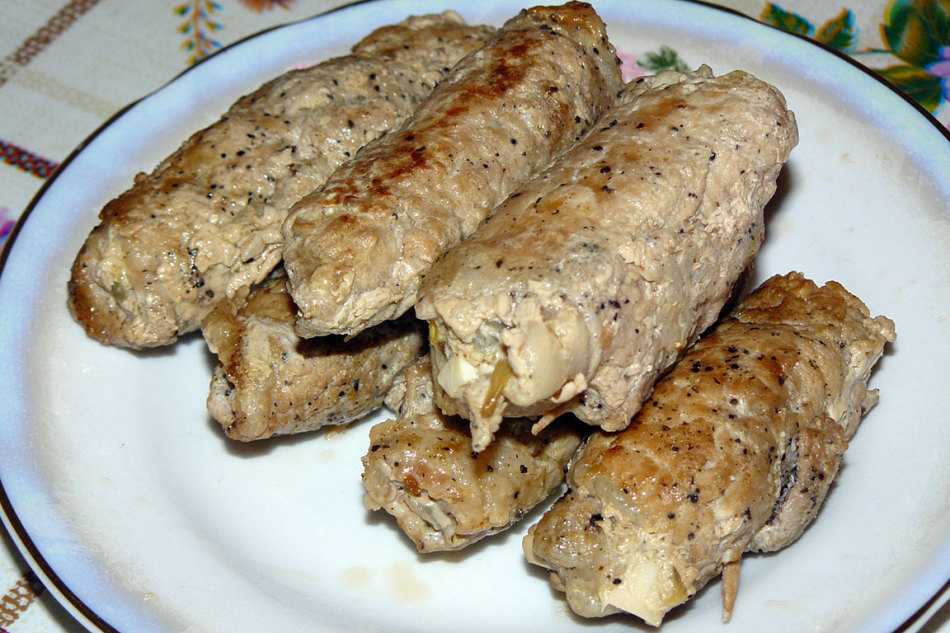 - В каждый пласт индюшиного мяса заверните начинку и скрутите пальчик, завязав его ниткой.