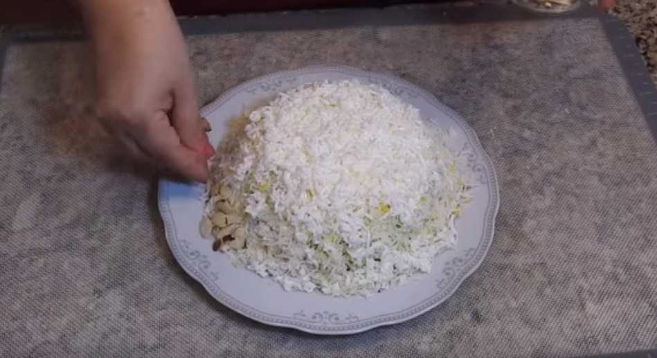 - Оставшиеся яичные белки пропускаем через мелкую терку и украшаем ими верхушку салата.