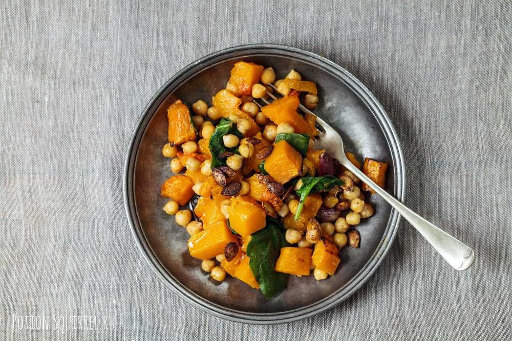 Рецепт салата из тыквы и нута выглядит следующим образом. Разогрейте до 200 °C духовку. Слегка смажьте маслом большой противень. Смешайте тыкву, 2 ложки столовые масла, молотый кориандр и тмин в большой миске. Приправьте солью и перцем. Разложите на подготовленный противень. Пеките на протяжении 20 минут, или пока тыква не станет мягкой. Дайте остыть.