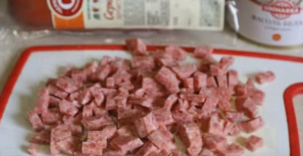 4. Снимаем с копченой колбасы пленку и крошим ее маленькими кубиками.