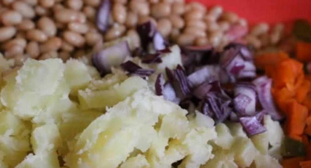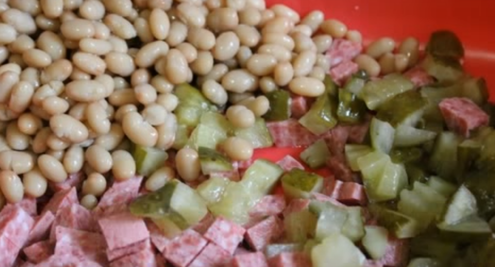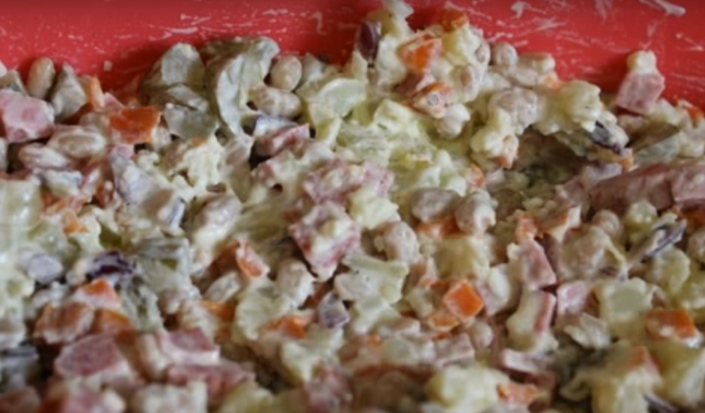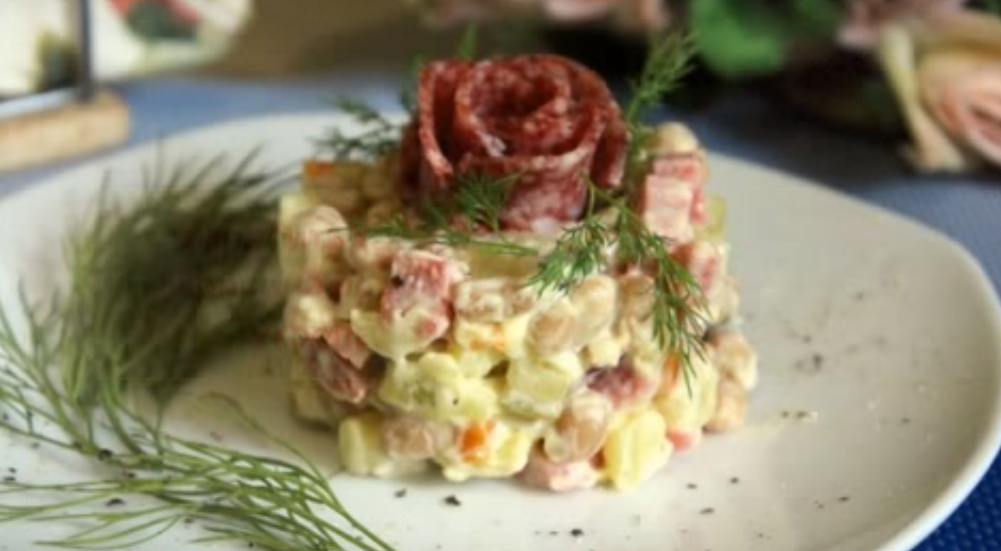 Рецепт салата Оливье по-новому с копченой колбасой и фасолью