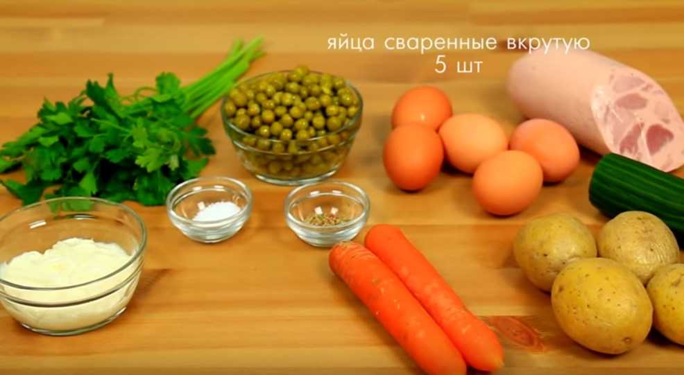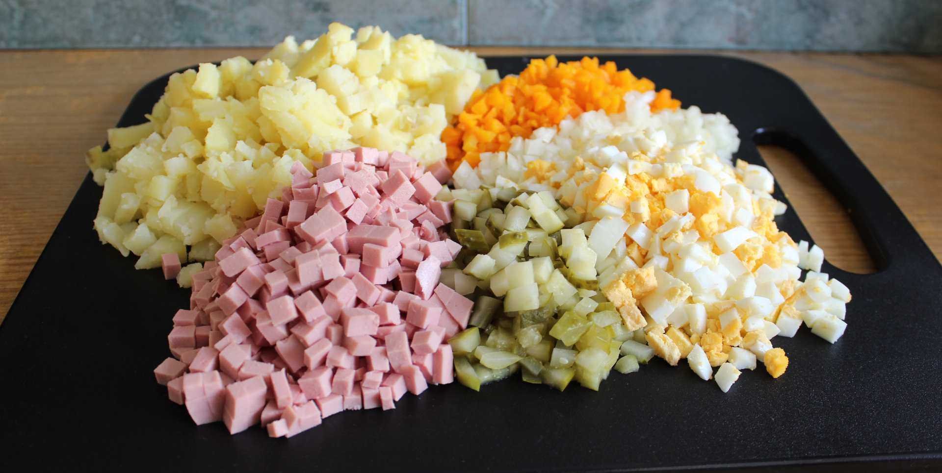 Но самым известным у нас идет этот состав: 2 картофелины, 400 г мяса (колбасы), горошек, 1 морковь и соленый огурец.