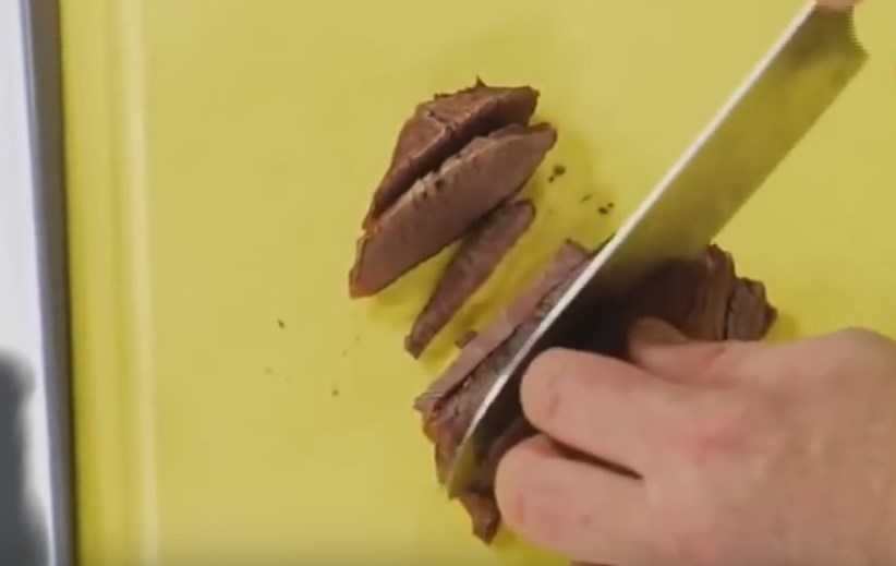 Резать мясо нужно остывшим, тогда получатся ровные брусочки.