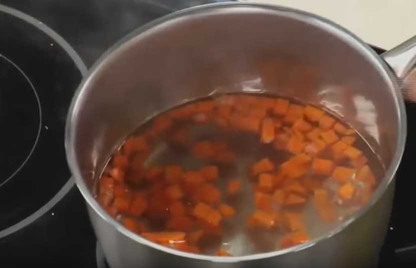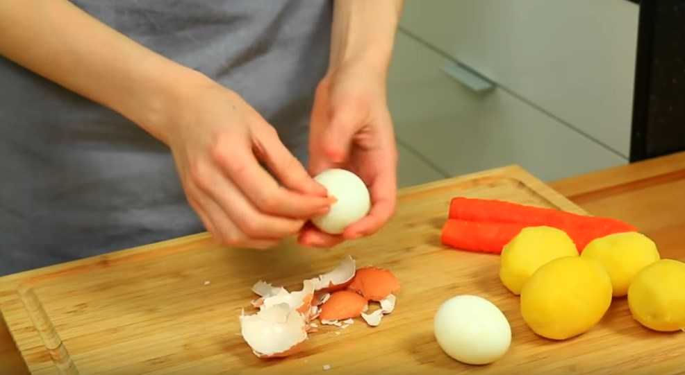 2. Яйца, картошку и морковку отварить в кожуре. Если вы решили варить эти продукты в общей посуде, то учтите, что яйца варятся быстрее всех. Им достаточно 5-7 минут после закипания. Картошка будет готова уже через 15-20 минут. Дольше по времени варится морковка.
