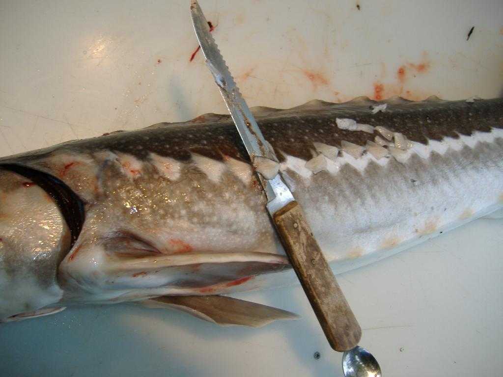 Если хотите удивить близких зрелищным блюдом, то коптите осетра целиком. Оставьте голову и наросты на спине, а чешую и внутренности удалите. В целом же осетрину разделывают так же, как и любую крупную рыбу. Сначала нужно ее почистить, выпотрошить и только потом отрезать голову и наросты на спине. Повара рекомендуют соблюдать именно такую последовательность. Если рыбка слишком крупная, то лучше ее разрезать на куски до пяти сантиметров толщиной, чтобы тушка лучше промариновалась.