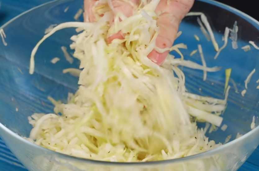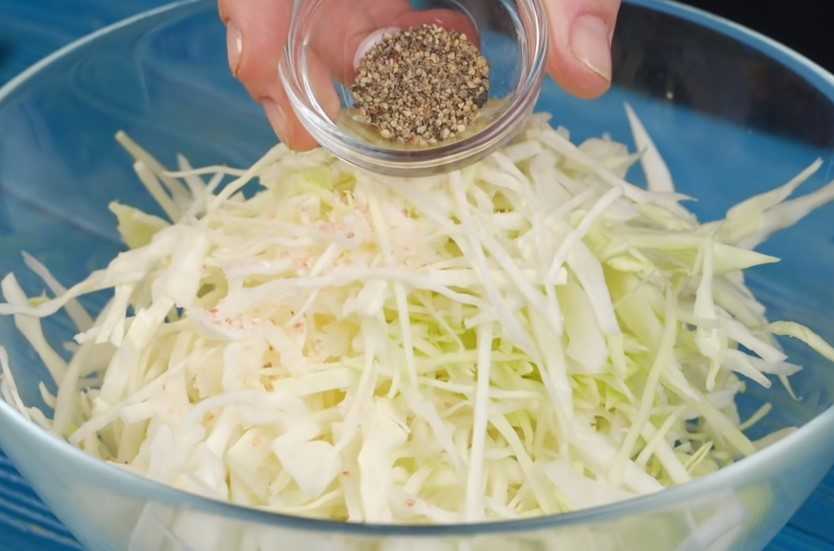 1. Белокочанную капусту тонко нашинкуем, добавим к ней щепотку соли и смесь молотых перцев. Специи добавляйте по своему вкусу.