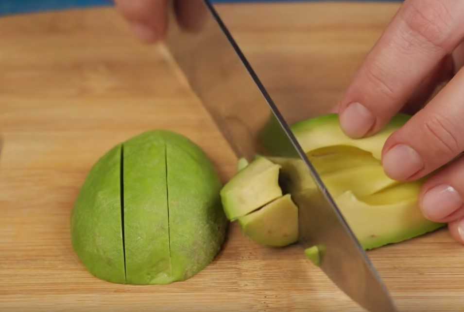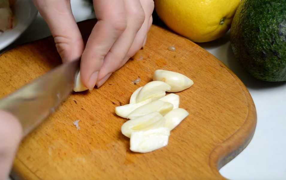 3. Пока обжаривается чеснок, порежем кубиками авокадо.
