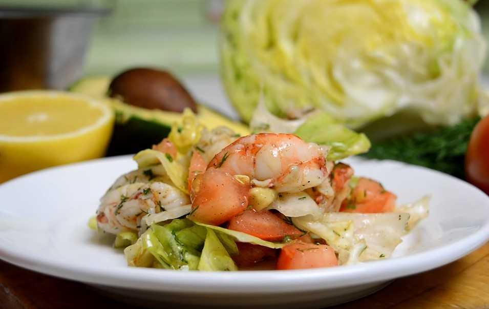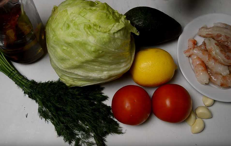 И напоследок, легкий и изысканный овощной салатик с добавлением креветок. С этим блюдом придется немного повозиться. Ну как повозиться… Если в предыдущих рецептах все ингредиенты нужно было просто помыть и порезать, то в этом блюде необходимо будет обжарить креветки. Но поверьте, эта закуска достойна быть поданной на Вашем столе!