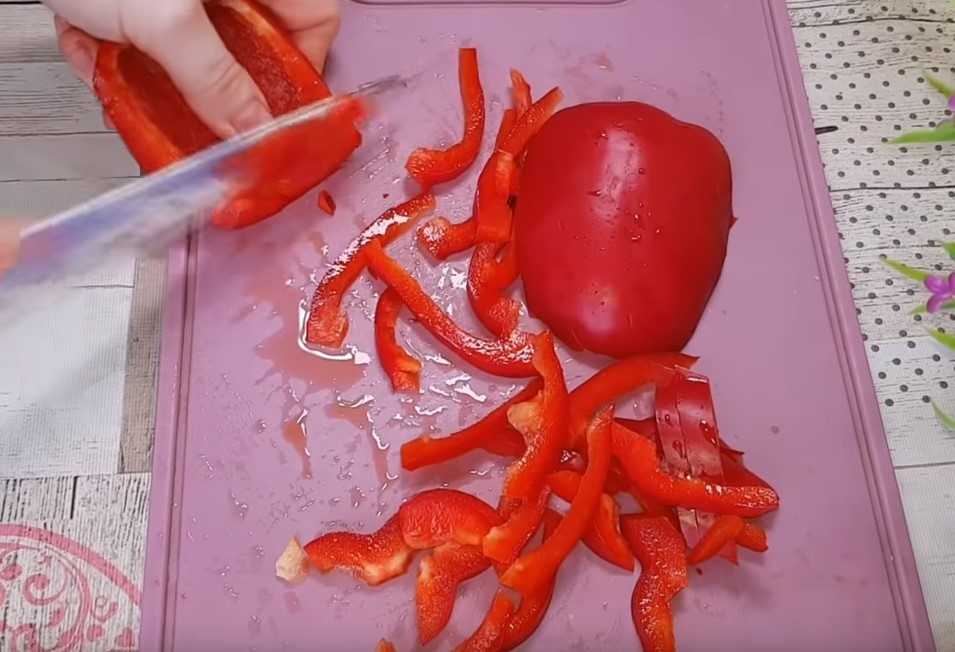 2. Болгарский перец очистите от семян и нарежьте соломкой. Салатный лук порежьте четверть-кольцами.