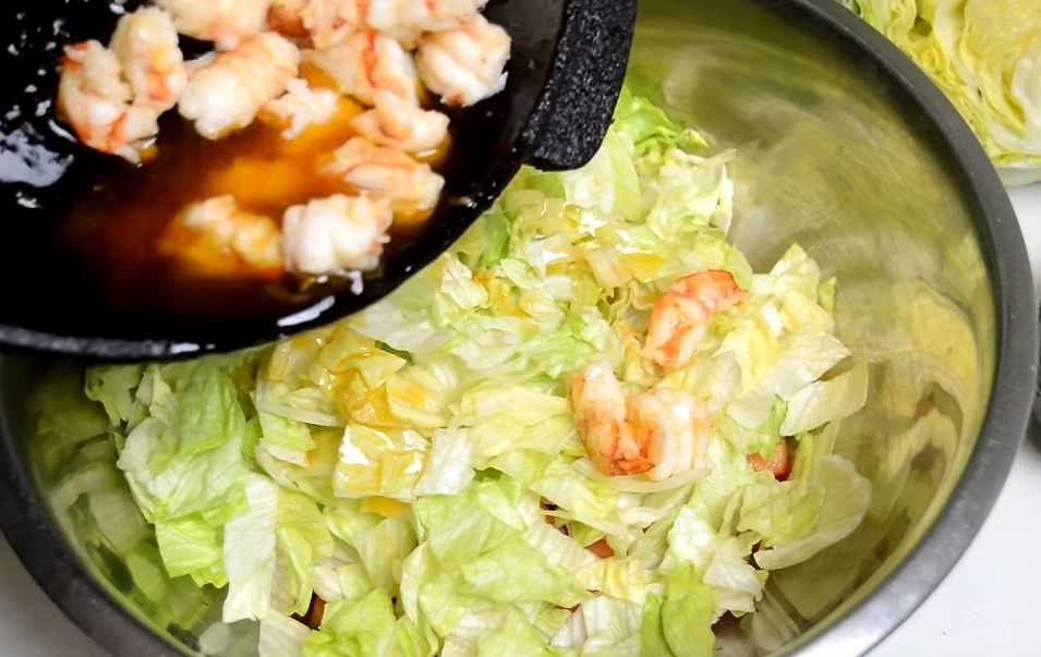7. Сюда же, выкладываем обжаренные креветки, предварительно остудив их. Выкладываем вместе с соусом, в котором членистоногие готовились.