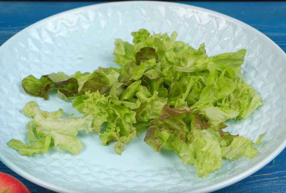 1. Хорошо помытые и обсушенные салатные листья рвем руками и укладываем равномерно на блюдо, на котором закуска и будет подаваться к столу.