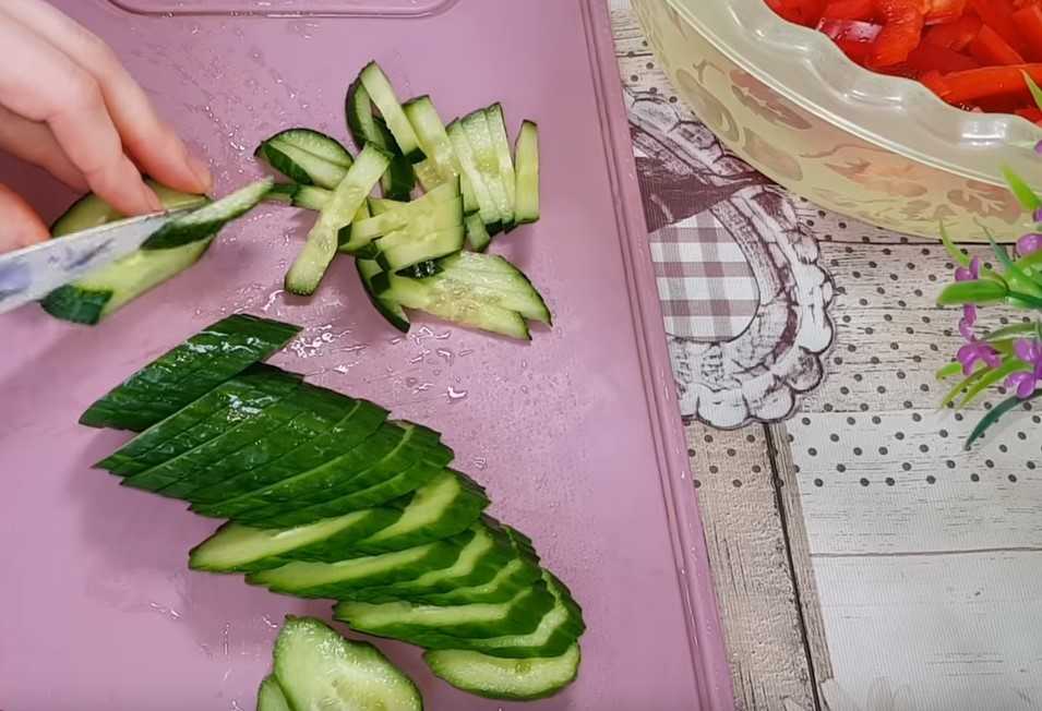 1. Нарежьте огурец. Старайтесь чтобы получились тонкие треугольники.