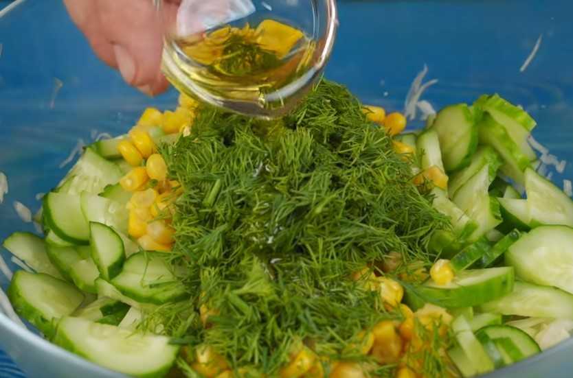 3. Соедините подготовленные компоненты. Насыпьте горошек и кукурузу, с которых предварительно слили маринад. Залейте растительным маслом и посолите. Перемешайте.