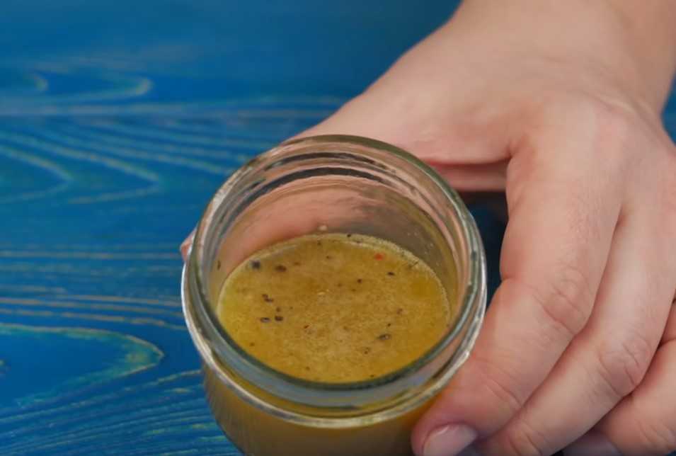 2. В маленькую баночку наливаем оливковое масло, лимонный сок, уксус, мед, соль, перец. Баночку плотно закрываем крышкой и содержимое хорошо встряхиваем на протяжении пары минут. За это время все ингредиенты смешаются, хорошо объединяться и получиться вот такая ароматная заправка.