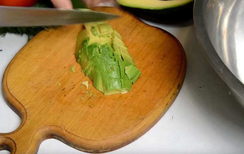 4. Небольшой авокадо чистим и нарезаем на кубики. Выкладываем туда же, в салатник.