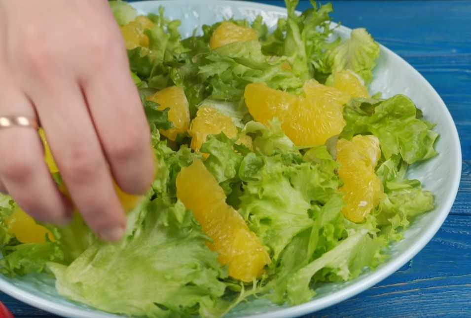 Очищенную мякоть апельсина выкладываем на листья салата.
