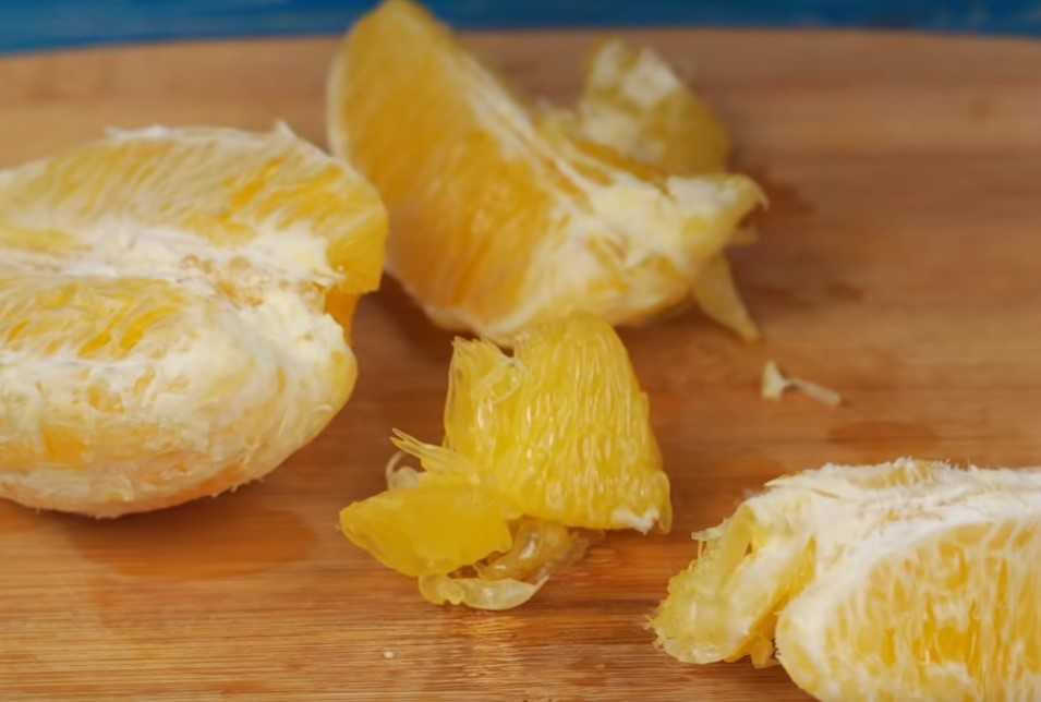 3. Апельсин почистим от кожуры и разделим на дольки. Нам понадобиться только мякоть, поэтому от пленок апельсин необходимо освободить.