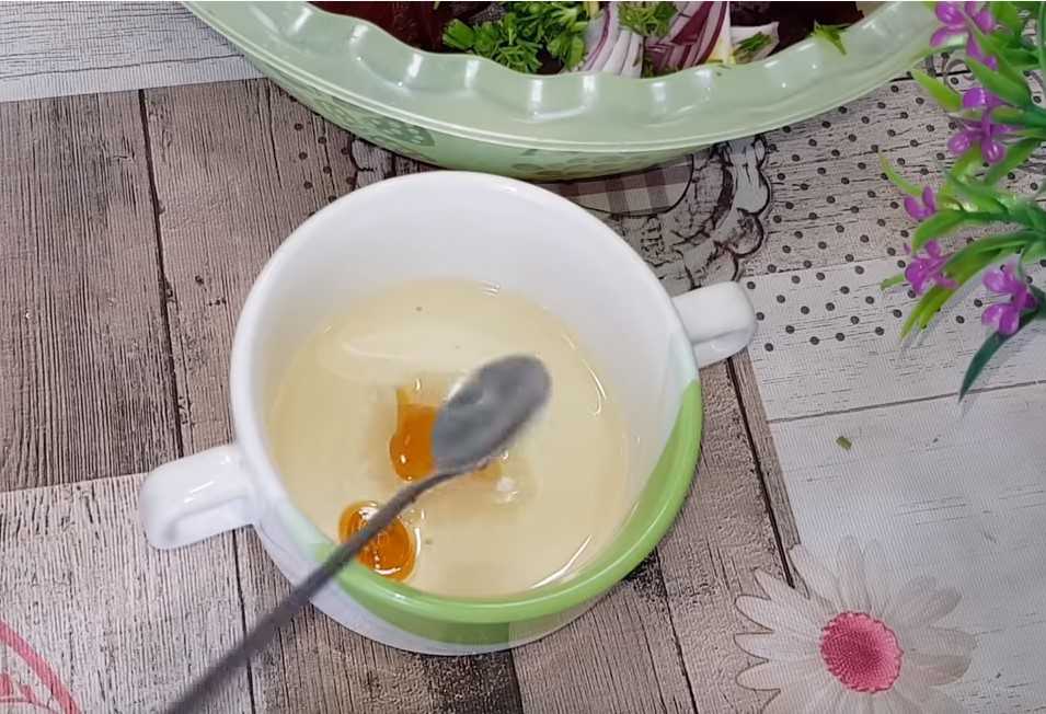 4. Приготовьте заправку: смешайте в пиале растительное масло, уксус и горчицу. Салат будет более полезным, если уксус будет натуральным (винным, бальзамическим, яблочным). Полейте салат заправкой и хорошо перемешайте.