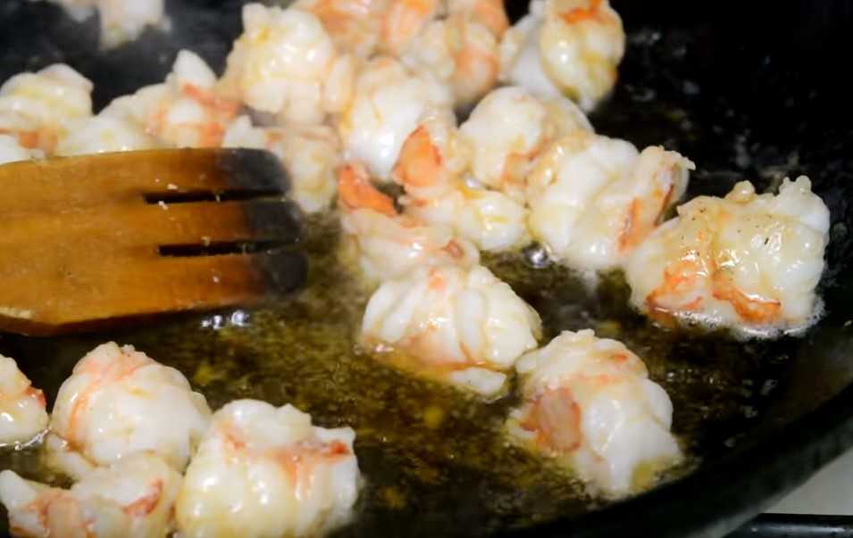 5. Тем временем, чеснок обжарился, отдал весь свой аромат и после зарумянивания чеснок убираем, а в чесночное масло выкладываем креветки. Обжариваем несколько минут, периодически помешивая. Сильно зажаривать креветки не нужно. Продукт это нежный, готовиться за считанные минуты.
