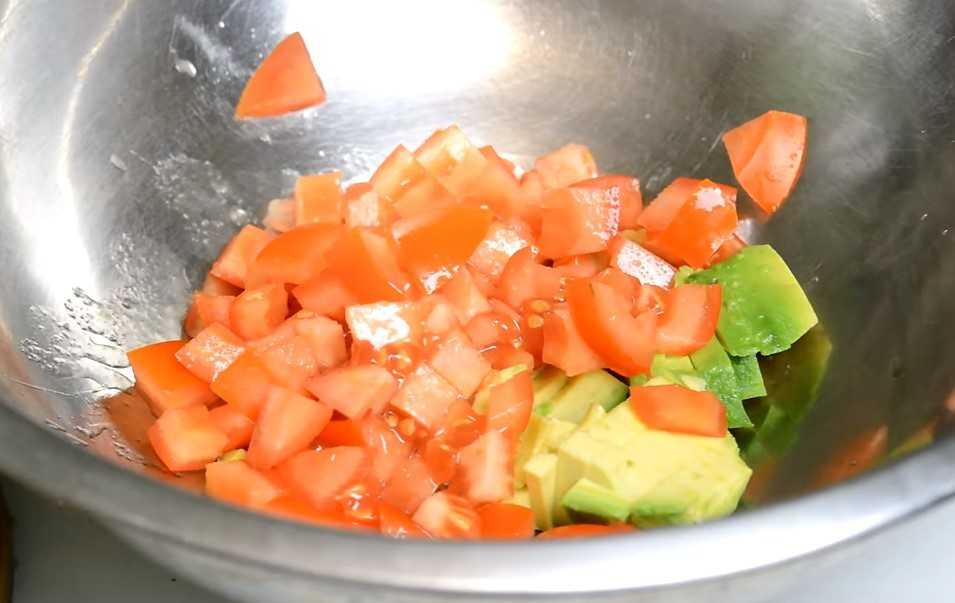 4. Томаты порежем кубиками примерно такого же размера, что и авокадо. Складываем все в салатник.