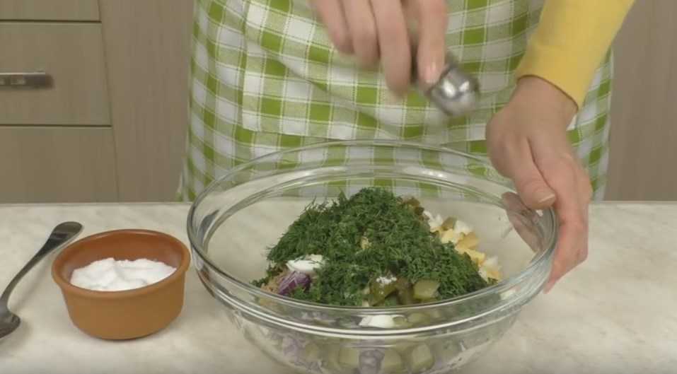 8. Соединяем все подготовленные ингредиенты в большом салатнике. Добавляем майонез и аккуратно перемешиваем. Сколько класть майонеза, зависит от вашего вкуса, на это количество продуктов будет достаточно трех-четырех ложек. Солим и перчим салат уже после того, как заправим, так как майонез и соленые огурцы придадут закуске свою соленость.
