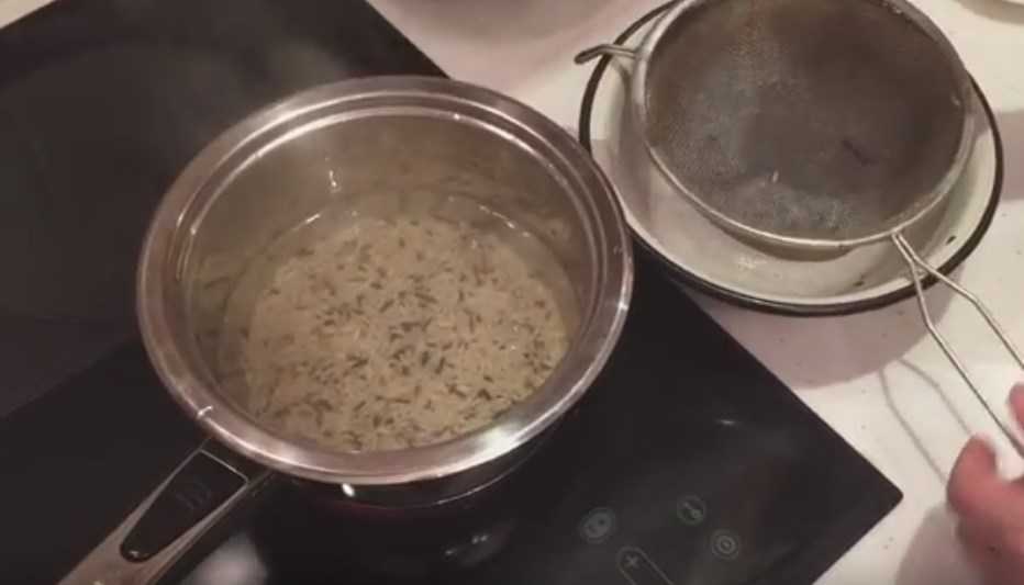 1. Приготовление начинаем с подготовки риса. Для этого крупу промываем, постоянно меняя воду. Либо выкладываем ее в сито и помещаем под струю проточной воды. При этом постоянно перемешиваем. Лучше использовать сорта риса, которые после варки становятся рассыпчатыми. Идеально подойдет пропаренный длиннозернистый или Жасмин. Промытую крупу перекладываем в подходящую кастрюлю и заливаем большим количеством фильтрованной воды. Слегка солим и ставим на средний огонь. Отвариваем крупу до готовности. Затем откидываем крупу на дуршлаг или сито и промываем, постоянно помешивая. Оставляем, чтобы стекла вся жидкость.