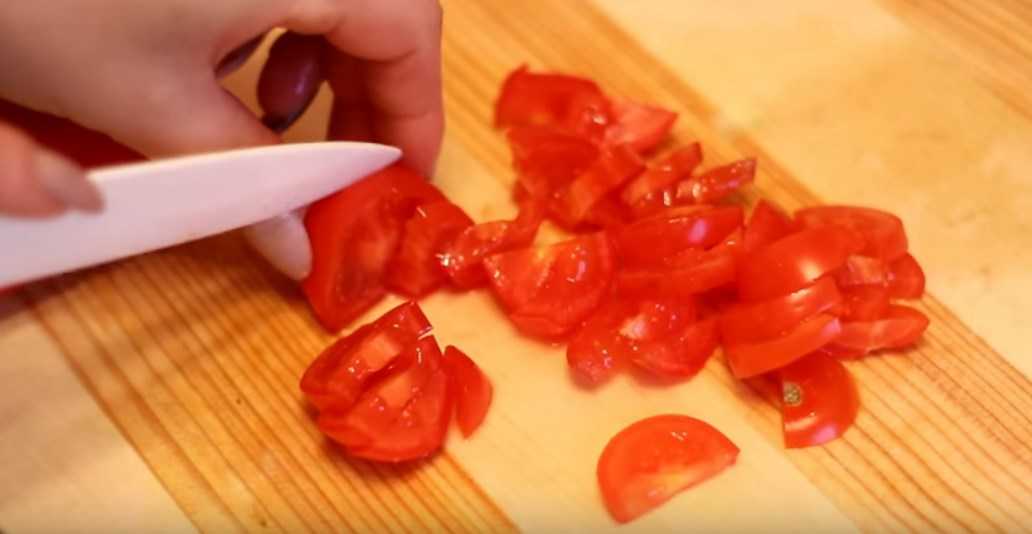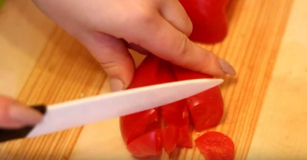 - Болгарский перец помыть, удалить плодоножку и очистить от семян. Нарезать брусочками.