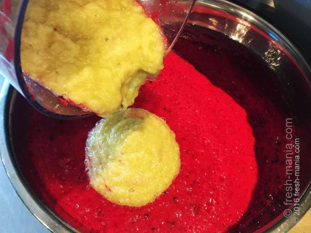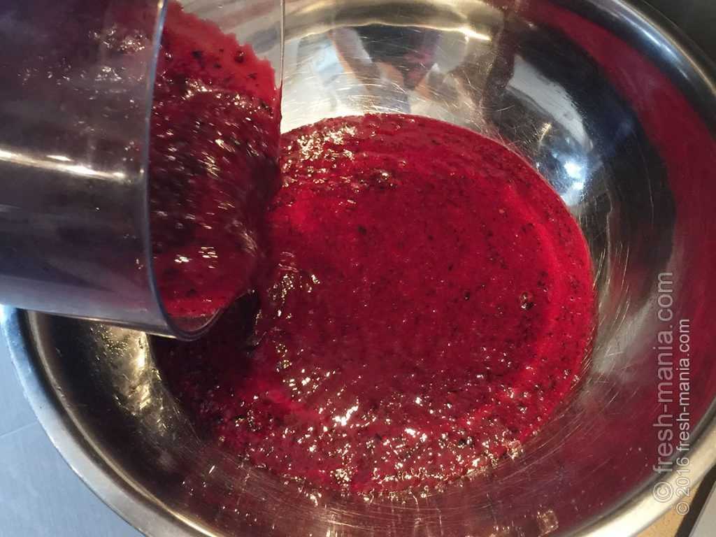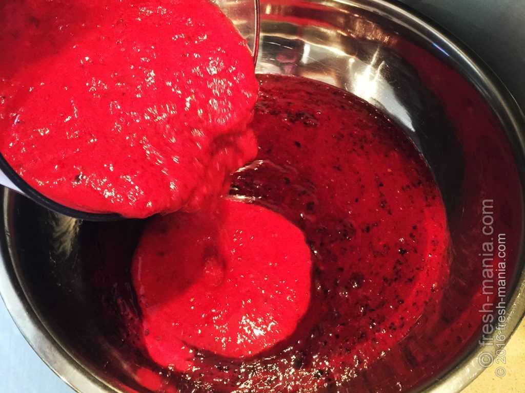 Затем перемалываем красную смородину. Здесь все проще, она перемалывается быстро и имеет более жидкую (водянистую) консистенцию. В готовой пастиле могут чувствоваться косточки, но это не проблема, если подумать, что это полезно для перистальтики кишечника. Выливаем красную смородину к черной.