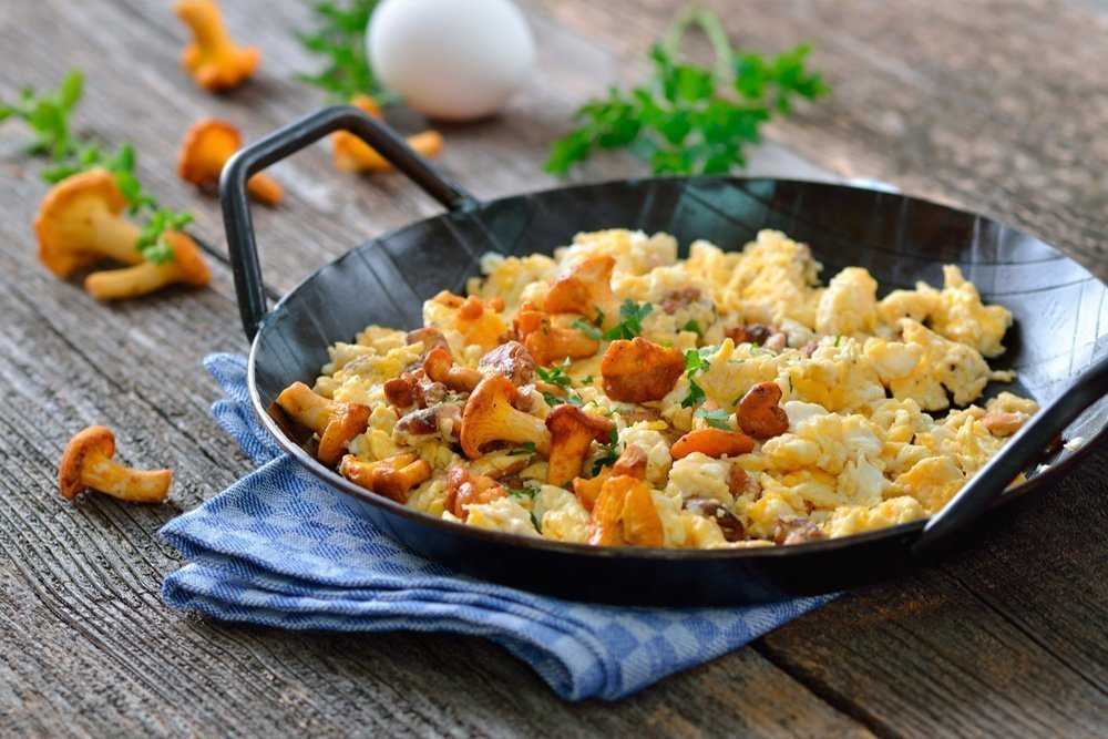 Пару яиц взбить с двумя ложками сметаны или молока. 100 г лисичек измельчить, луковицу нарезать полукольцами. Слегка обжарить лук с грибами. Затем вылить яично-молочную смесь на другую сковороду, посолить и поперчить. Закрыть крышкой и готовить на малом огне. Когда омлет будет готов, сверху выложить грибную начинку и свернуть омлет пополам.