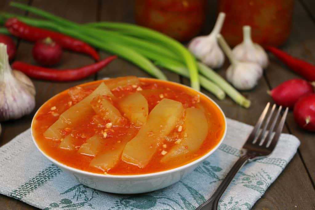 Очень вкусным получается «Тещин язык», приготовленный в остренькой аджике. Приятный овощной аромат в сочетании с острым вкусом идеально сочетается с мясными блюдами и гарнирами.