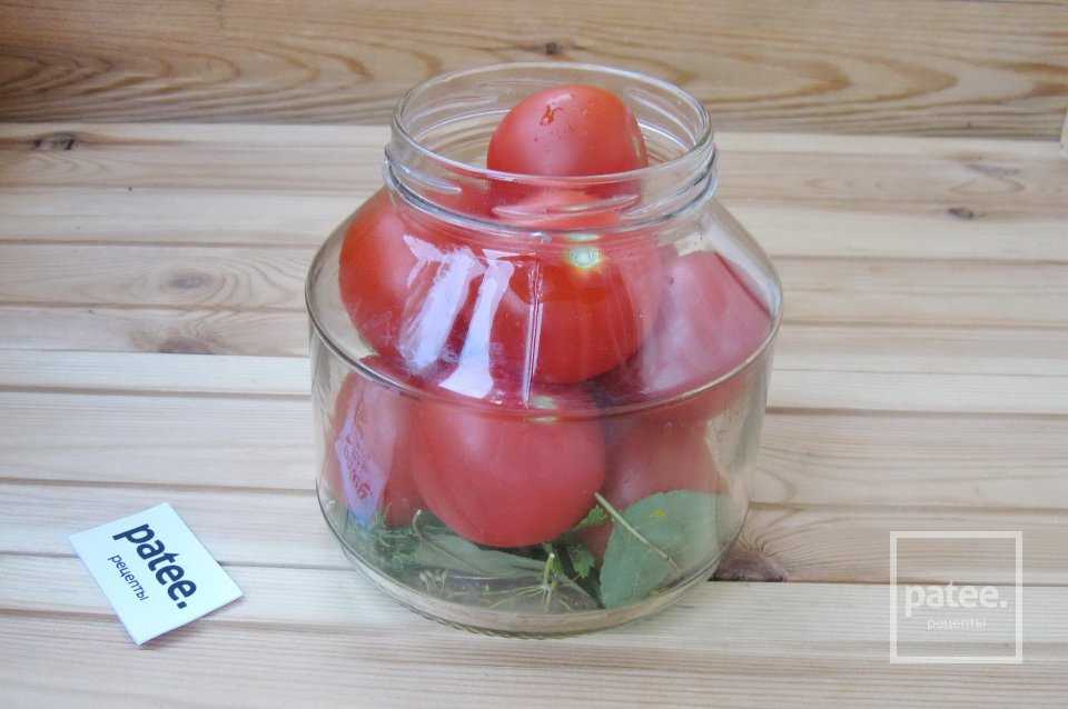 - В стерилизованную банку укладываем зелень, вымытые помидоры.