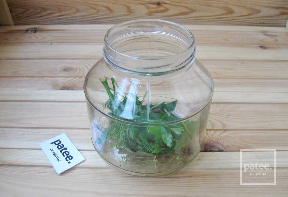 Банку помойте и простерилизуйте любым способом. Листья хрена и укроп помойте, немного обсушите и выложите на дно банки.