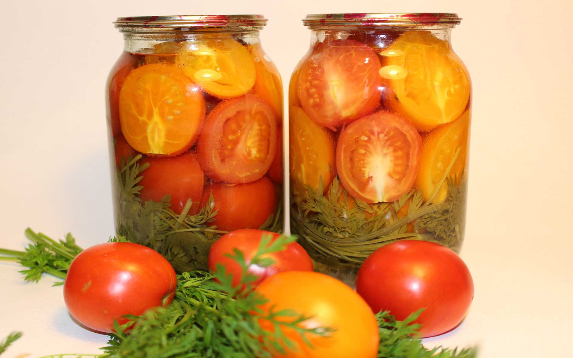 - Помидоры промойте, нарежьте половинками. Стерилизуйте банки на пару.