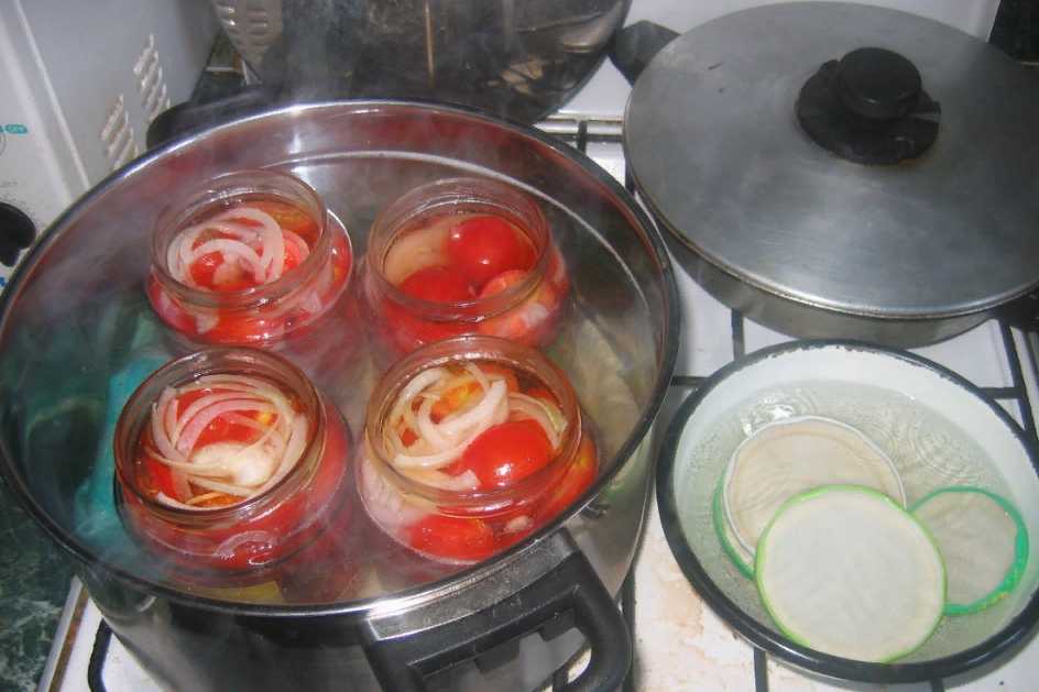 Сверху на банки кладутся металлические крышки (кладутся, но не закатываются). Емкости ставятся в эмалированный таз или большую кастрюлю, заливаются по плечики теплой водой. На огне жидкость и банки доводятся до кипения, затем таз отставляется в сторону. Банки при помощи щипцов или полотенец вынимаются. Плотно закатываются и переворачиваются вниз крышкой. Сверху на банки накрывается одеяло. Через двое суток консервы переносятся в кладовую.