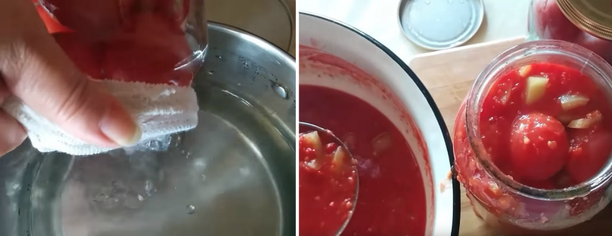 Сливаем воду из банок с томатами и разливаем в них кипящий томатный сок, если ваши томаты уложены в банки достаточно плотно, то сока хватит залить все пять баночек почти под крышку.