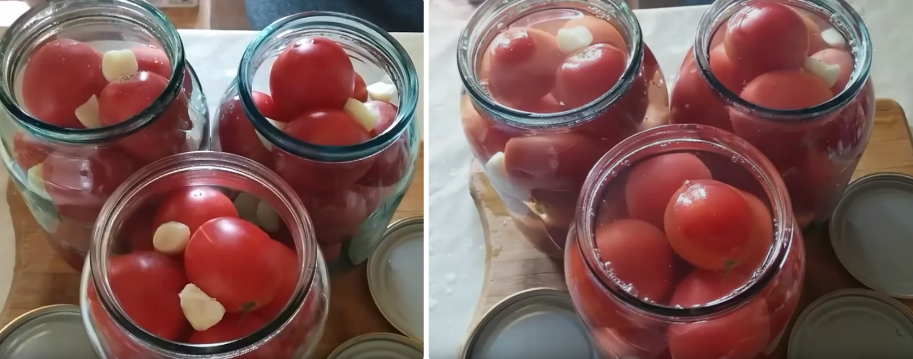 Повторно заливают, выдерживая в течение 3-х минут. Слишком мелкие помидоры не требуется заливать во второй раз.