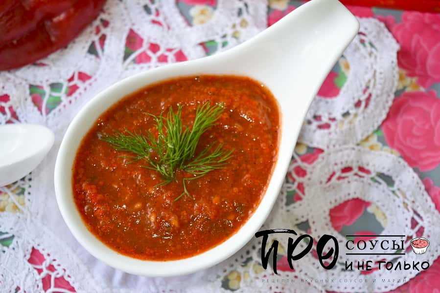 В этой заготовке присутствует тонкий аромат восточных пряностей с ярко выраженным вкусом свежих помидор, болгарского и горького перца чили, чеснока — это волшебное сочетание, воплощенное в мягком, слегка остром соусе, он получается изысканно вкусным, горячо-сладким. Прекрасно сочетается с кебабом и любыми мясными блюдами, включая мясо птицы. Готовится очень просто.