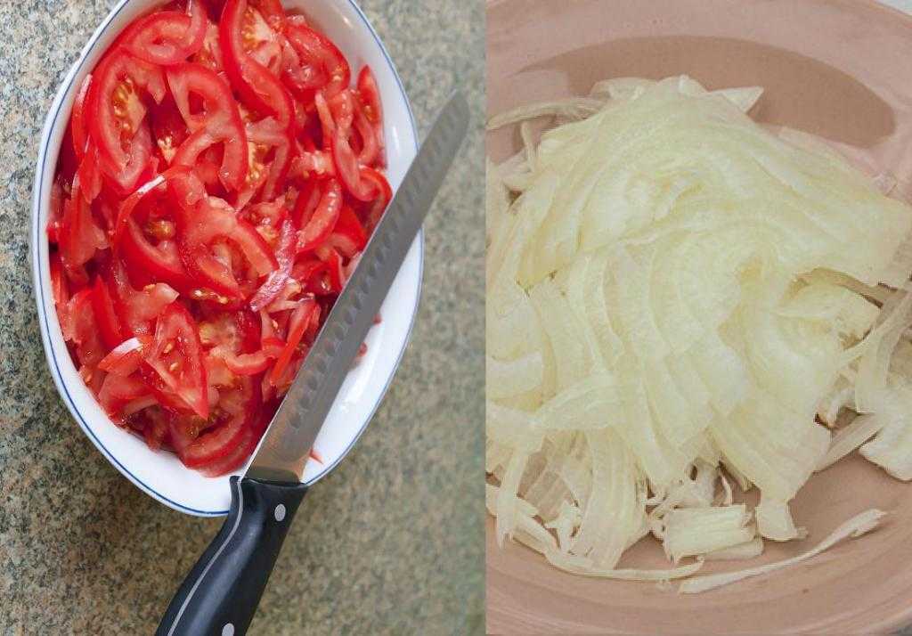 Для приготовления салата потребуется также острый нож, чтобы помидоры нарезать тонкими слайсами. Узбекские профи при нарезке помидоров не используют досок, они нарезают помидоры остро заточенными ножами прямо на весу.