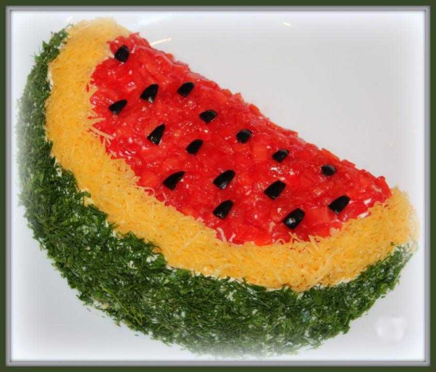 - Подойдет салат для любого праздника, и форму можно придумать самую разную, как круглую, квадратную, полукруглую и т.д. Салат выкладывают как в общий стол, так и подают порционно, в виде маленьких арбузных долек.