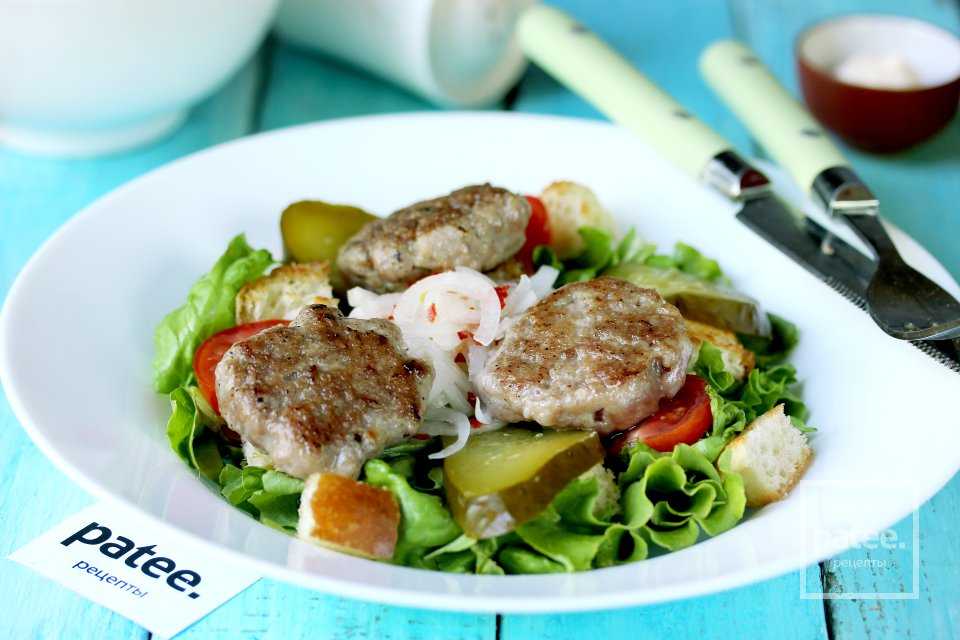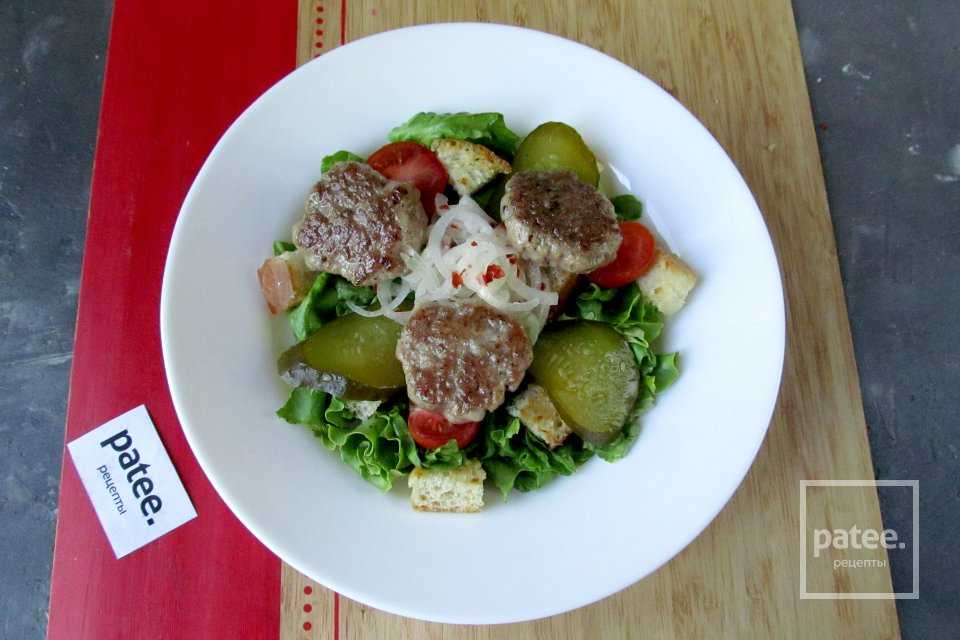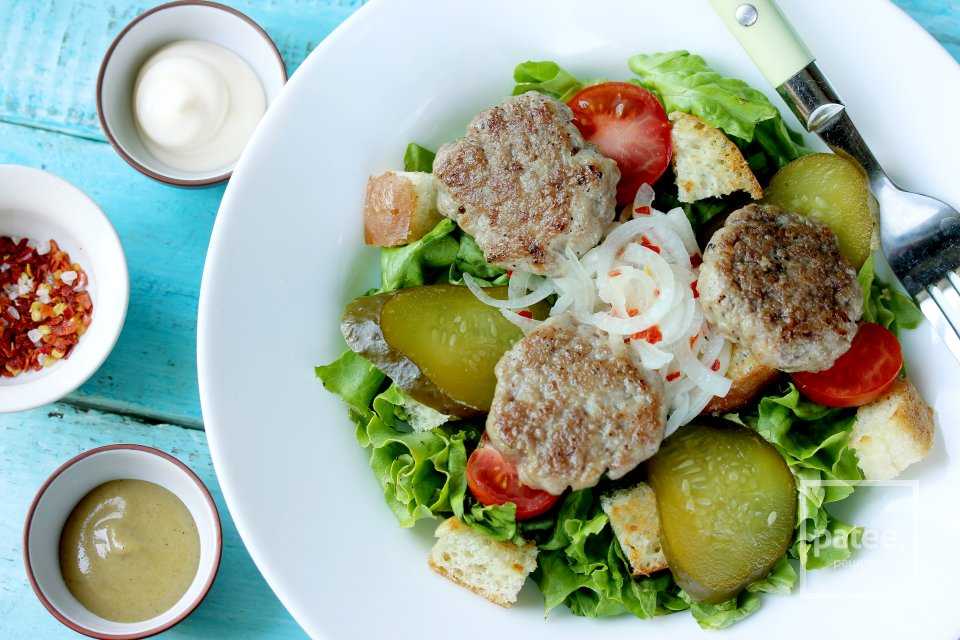Тщательно вымешиваем говяжий фарш с солью и перцем, отбиваем его (поднимаем и снова бросаем в миску в течении 1-2 минут), затем формируем 6 небольших плоских котлет. В сковороде разогреваем подсолнечное рафинированное масло. Выкладываем в разогретое масло котлетки для нашего оригинального салата.